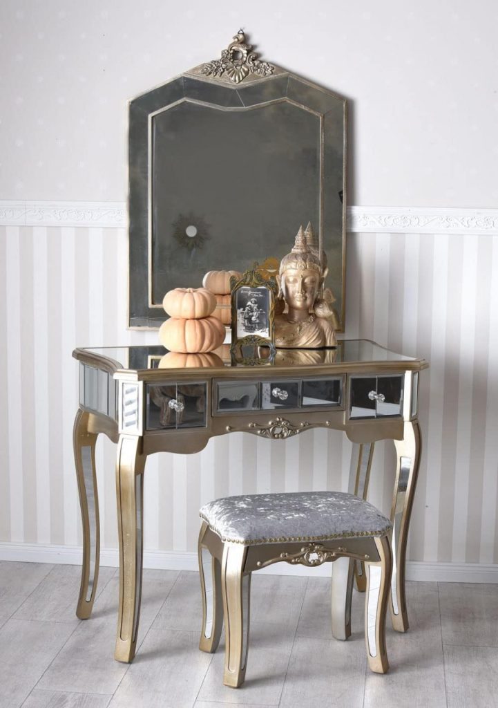 SEG111 – Set Masa Argintie toaleta, 90 cm, cosmetica machiaj oglinda masuta, scaun, taburet tapitat